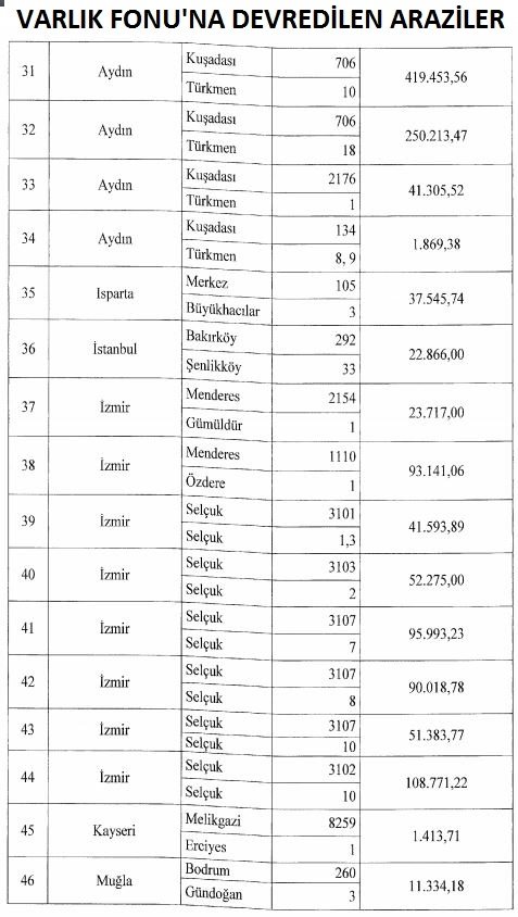 Varlık Fonu’na devredilen arazilerin bir bölümünün büyüklüğü: