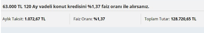 Yayınlanan her ilanın satış fiyatı banka tarafından o ilana özel olark belirlenirken örnek olarak Şanlıurfa’da konut imarlı bir arsanın satışı satış fiyatı 71 bin TL olarak ilan edildi. Bu fiyat ile bu arsayı alacak kişiler yüzde 10 peşinat öderken 8 bin TL peşinat veren birisi kalan miktar için de 120 ay vadeli arsa kredisi çekmesine imkan sunuluyor.